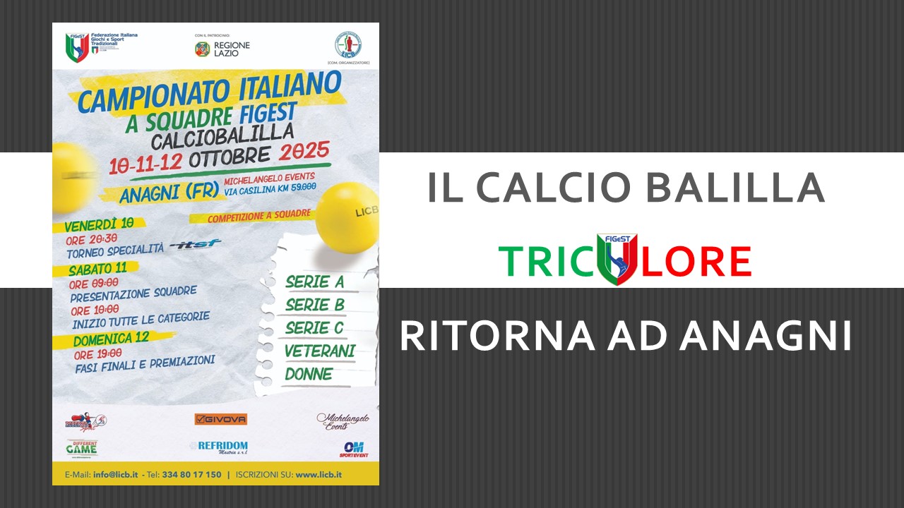 Anagni si prepara ad ospitare il prossimo fine settimana, dal 10 al 12 ottobre, uno degli eventi più attesi della Federazione Italiana Giochi e Sport Tradizionali FIGeST: il Campionato italiano a squadre di calcio balilla. L’evento, organizzato in collaborazione con la Lega Italiana Calciobalilla LICB e con il patrocinio della Regione Lazio, trasformerà il Michelangelo Events in un’arena di passione e competizione sportiva.