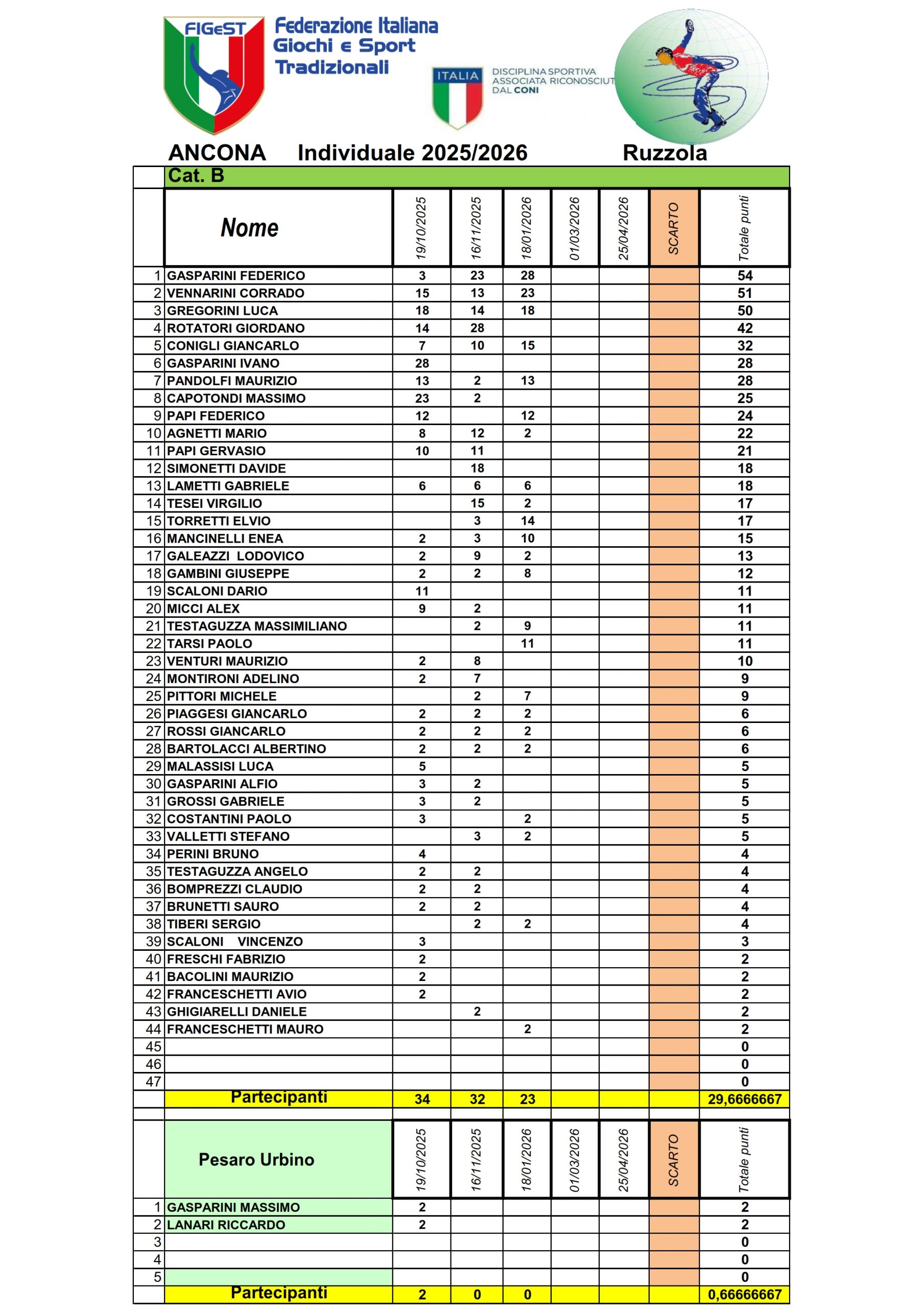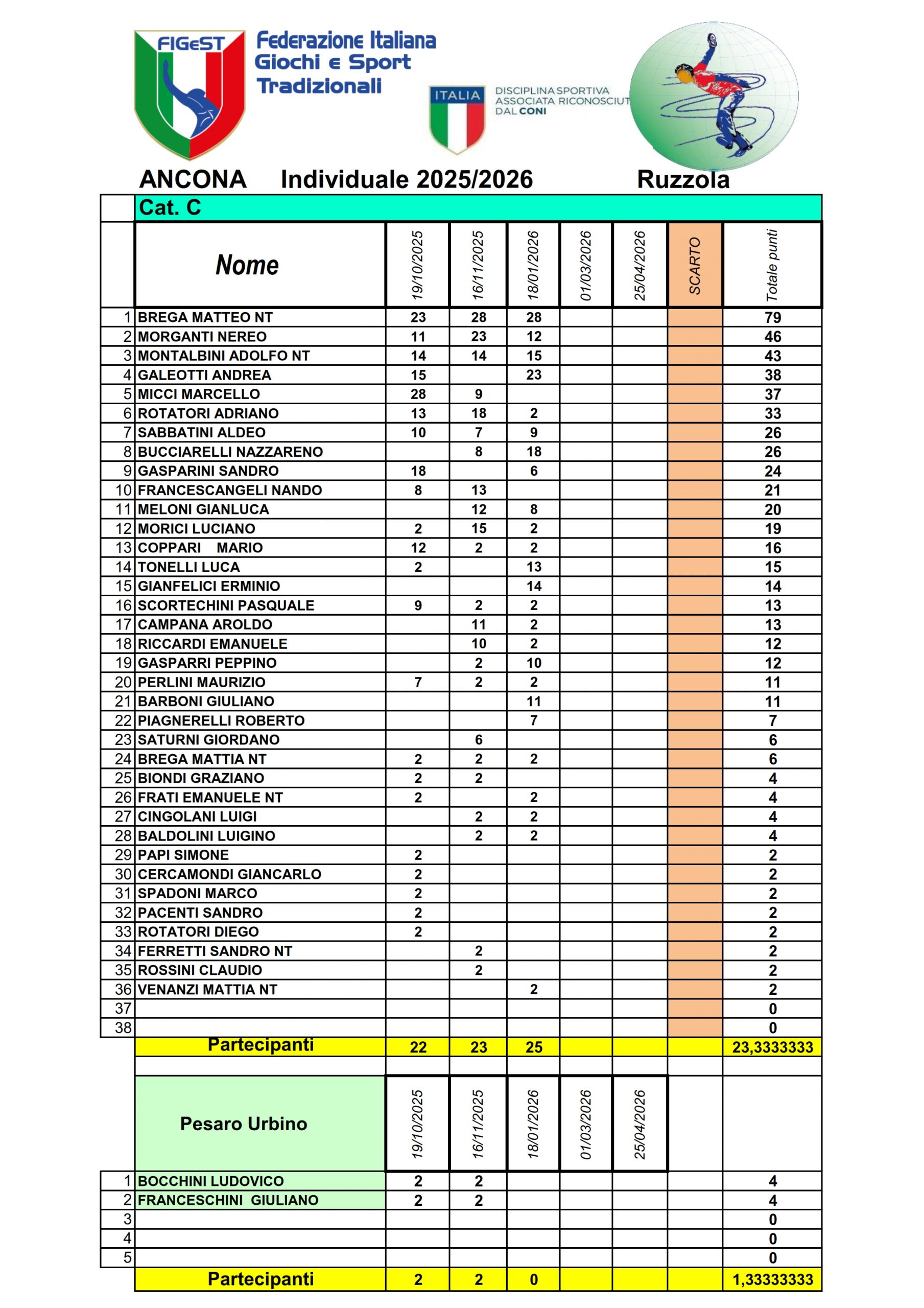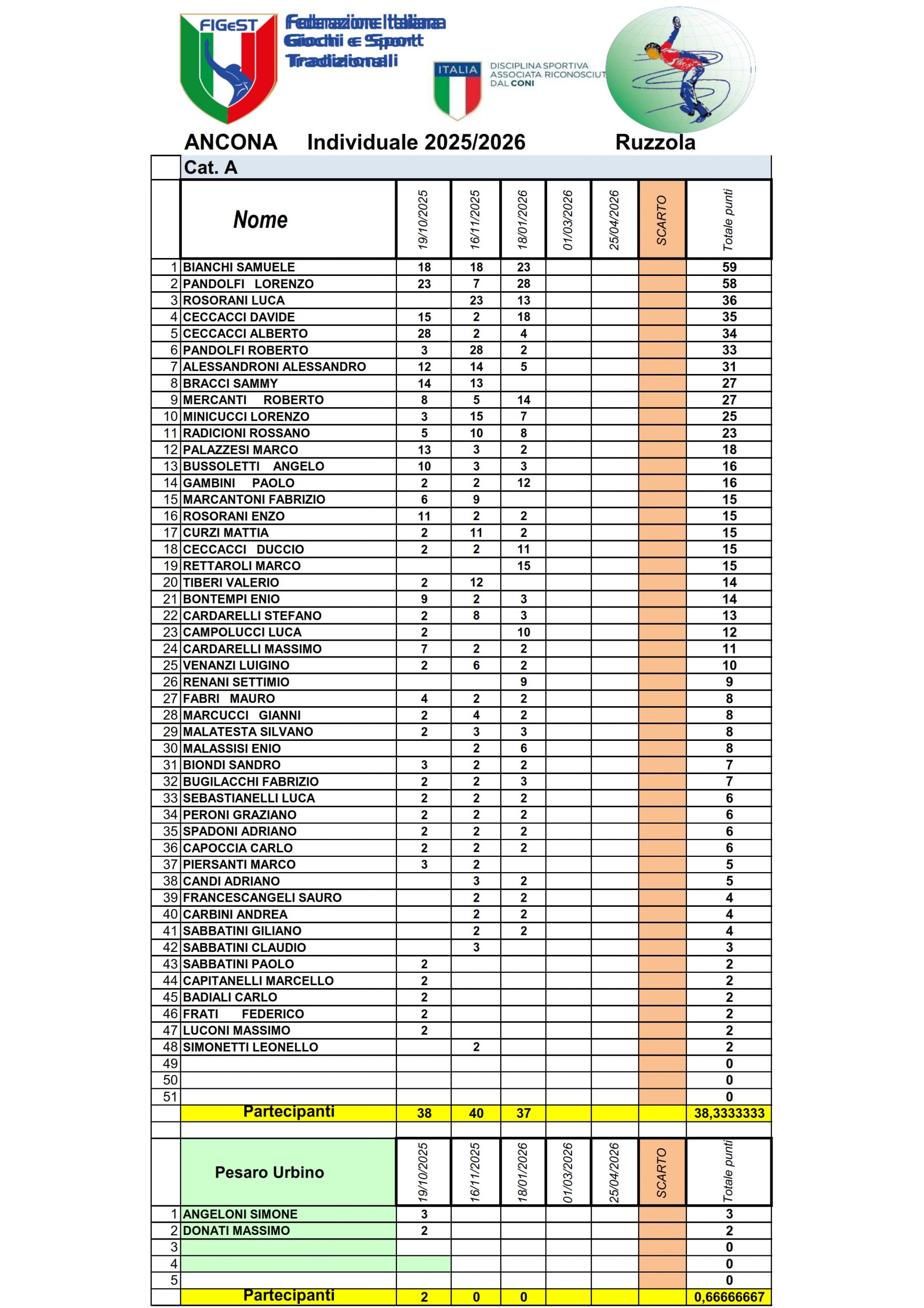Classifica Individuale Ruzzola 2025-2026 Ancona Pesaro