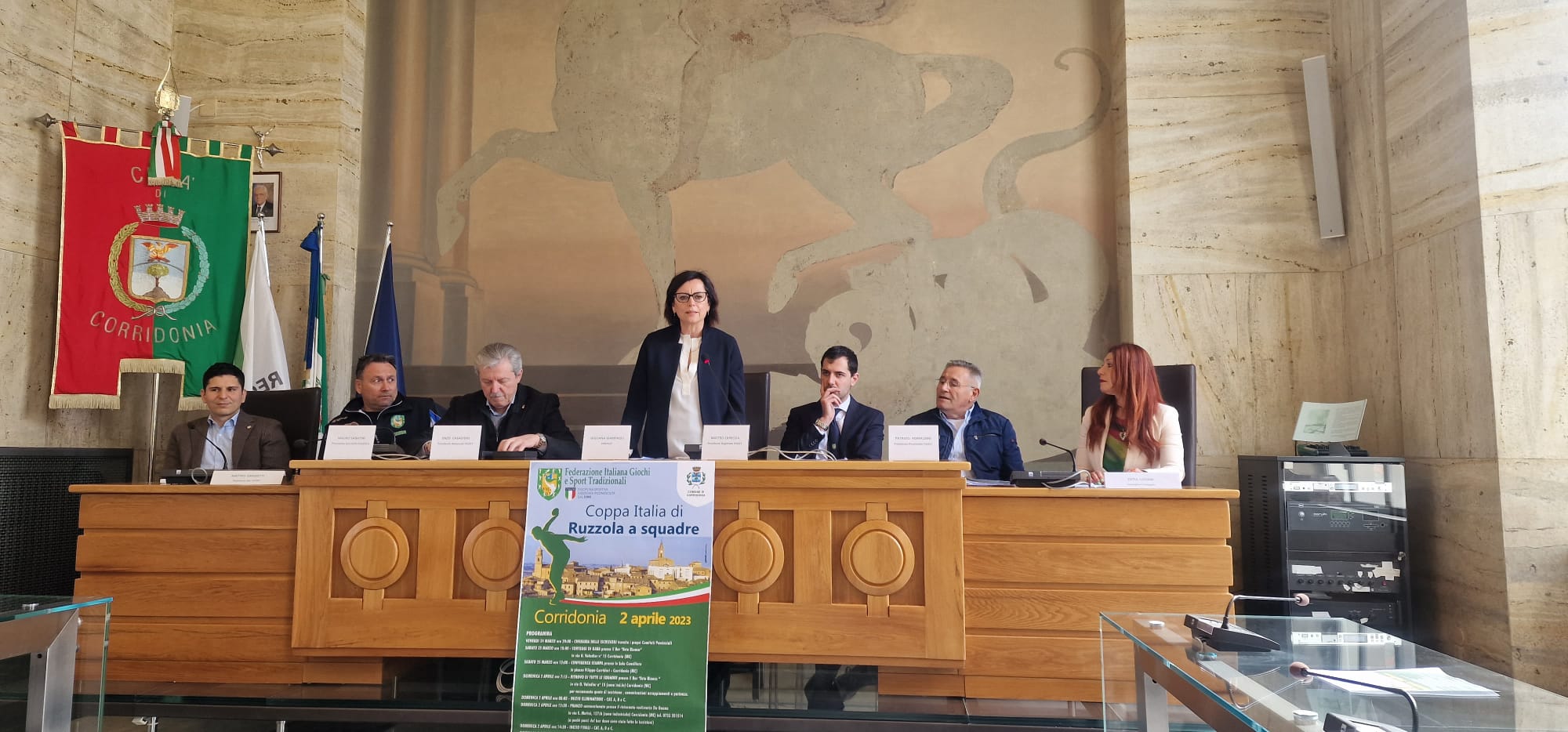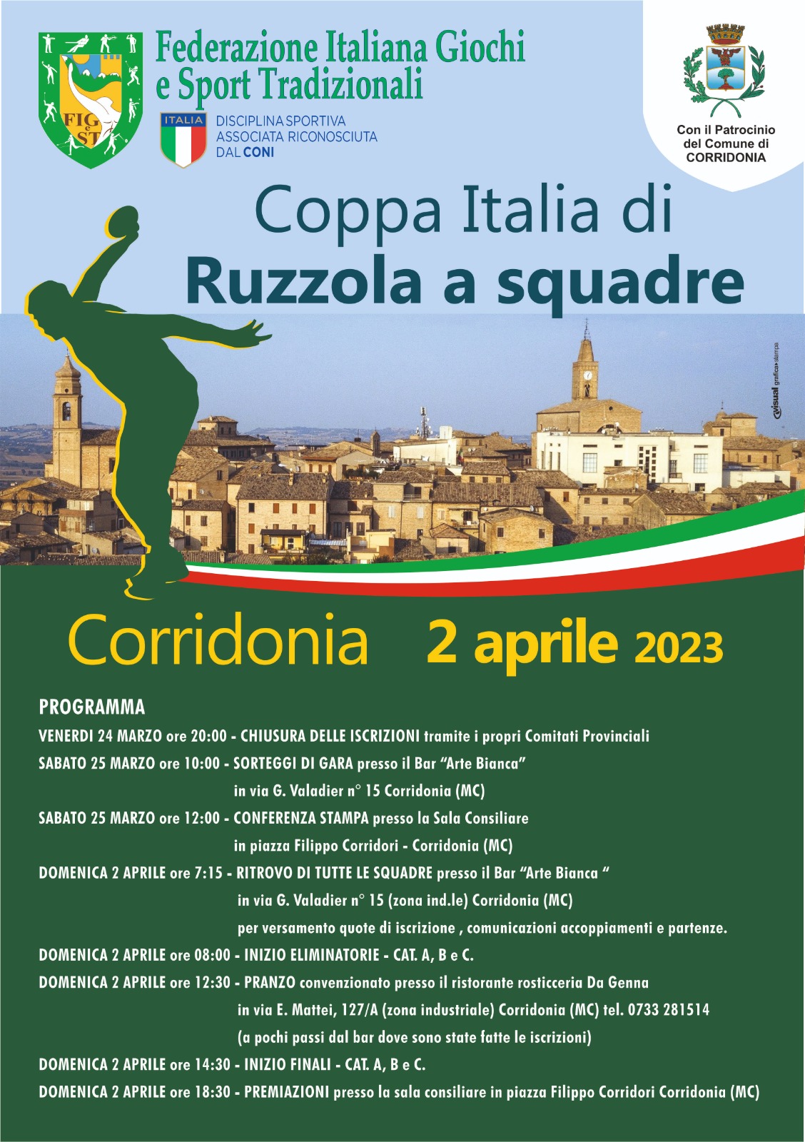 L’evento sportivo è promosso dalla Figest, la Federazione Italiana Giochi e Sport Tradizionali, in collaborazione e con il patrocinio dell’Amministrazione comunale che ha presentato la sfida di Coppa Italia nel corso di un incontro cui hanno preso parte sindaco di Corridonia, Giuliana Giampaoli, l’assessore allo Sport, Matteo Grassetti, il consigliere comunale Catia Luciani, impegnata in prima persona nell’organizzazione, il presidente nazionale di Figest, Enzo Casadidio, il presidente regionale Marche, Matteo Capeccia, il presidente provincia, Patrizio Romaldini, il presidente di specialità della ruzzola, Mauro Sabatini.