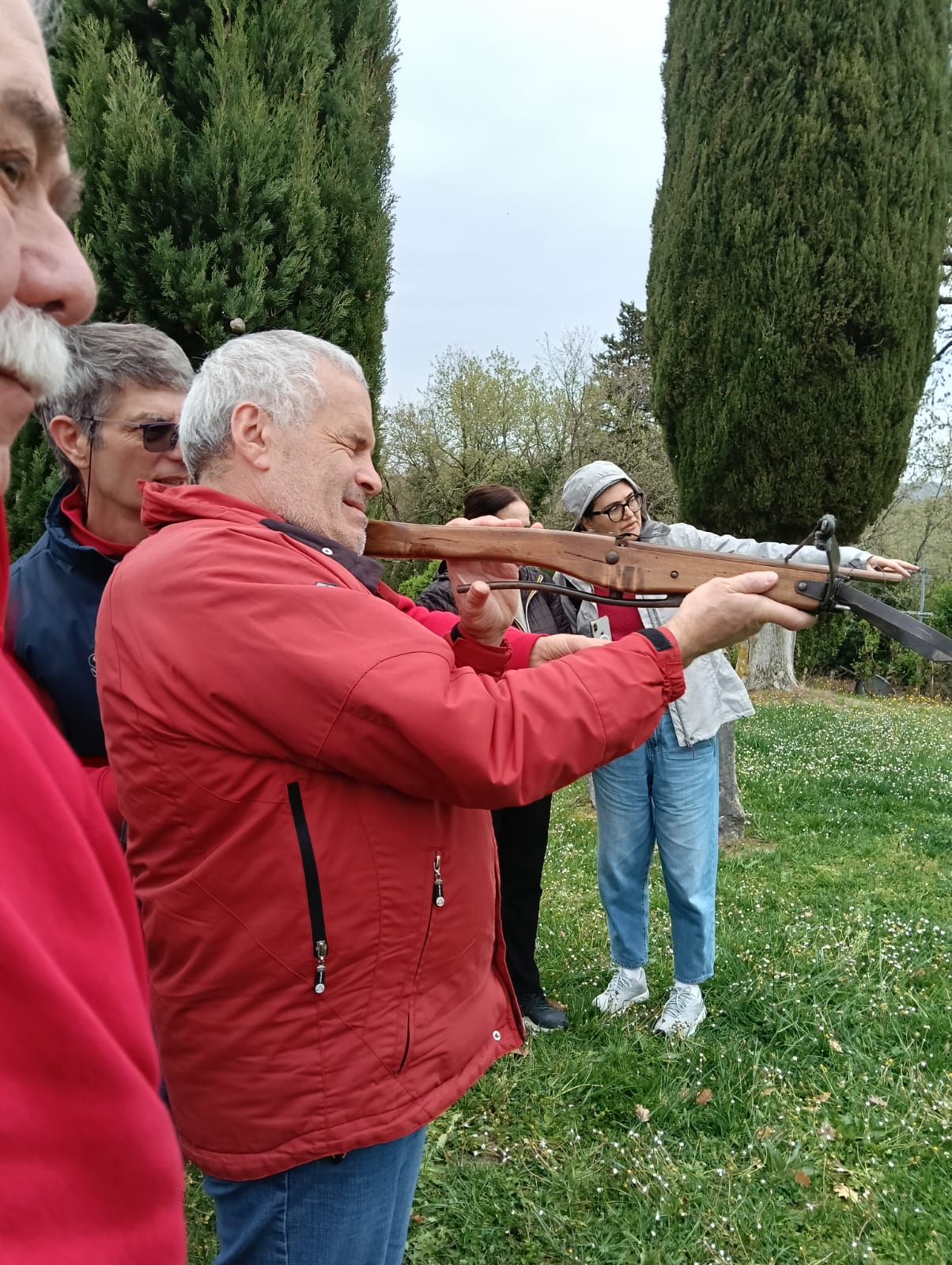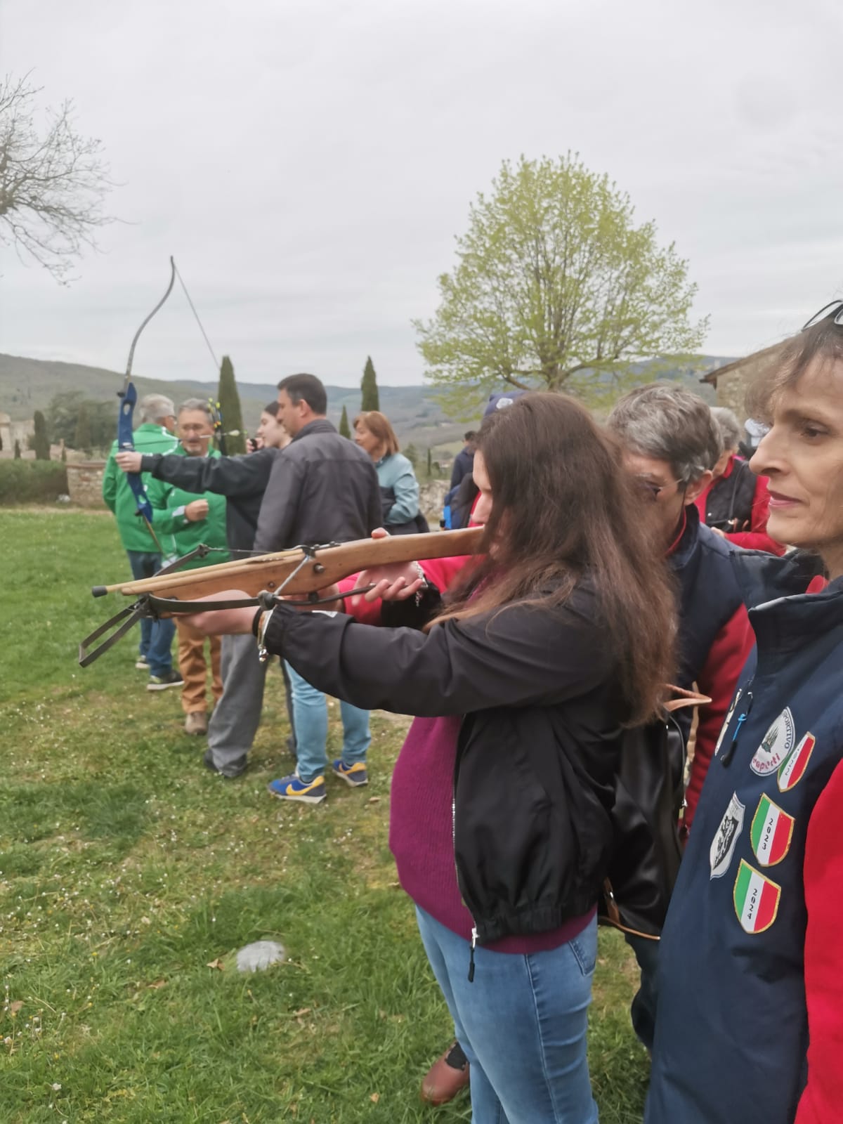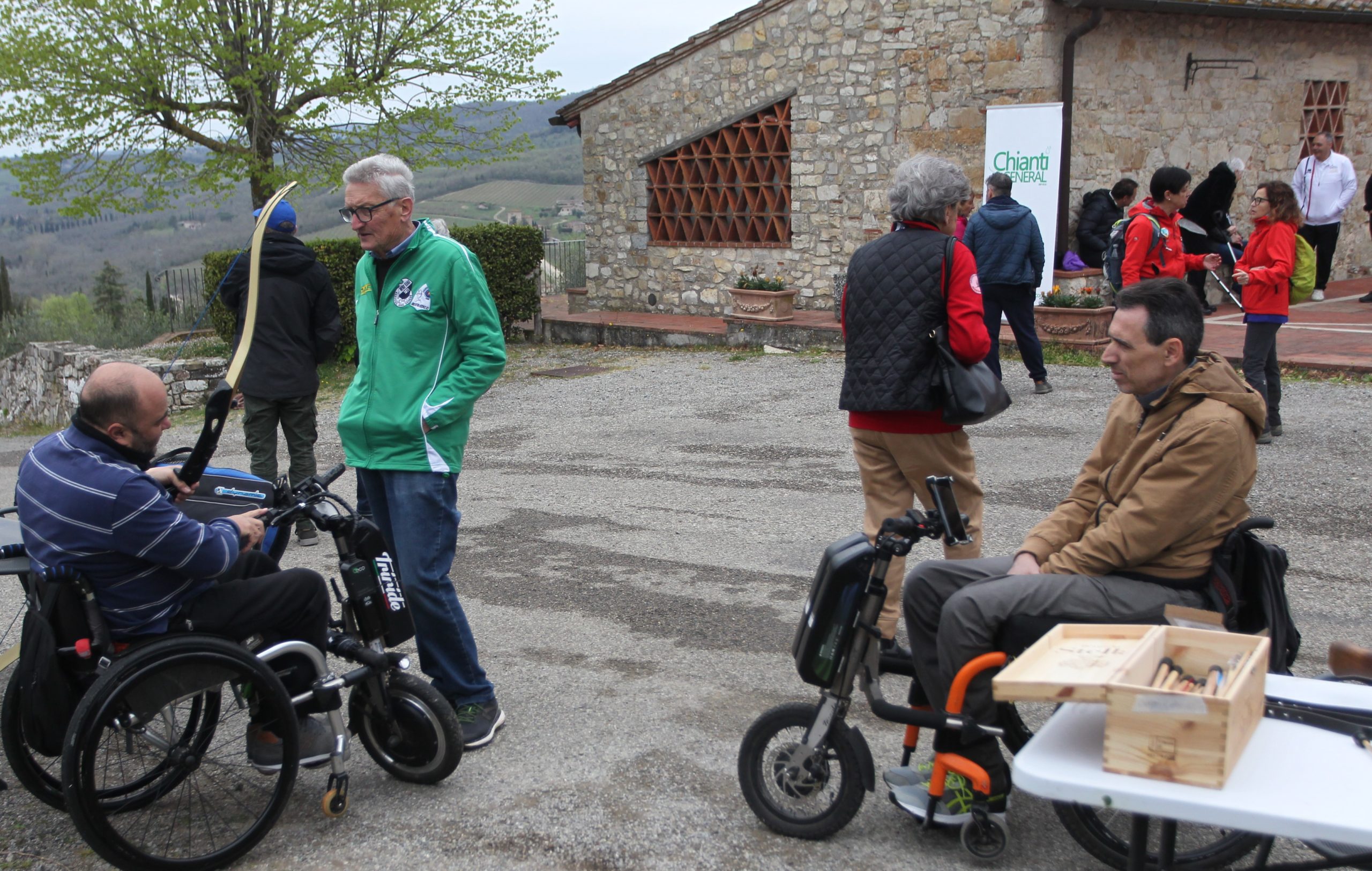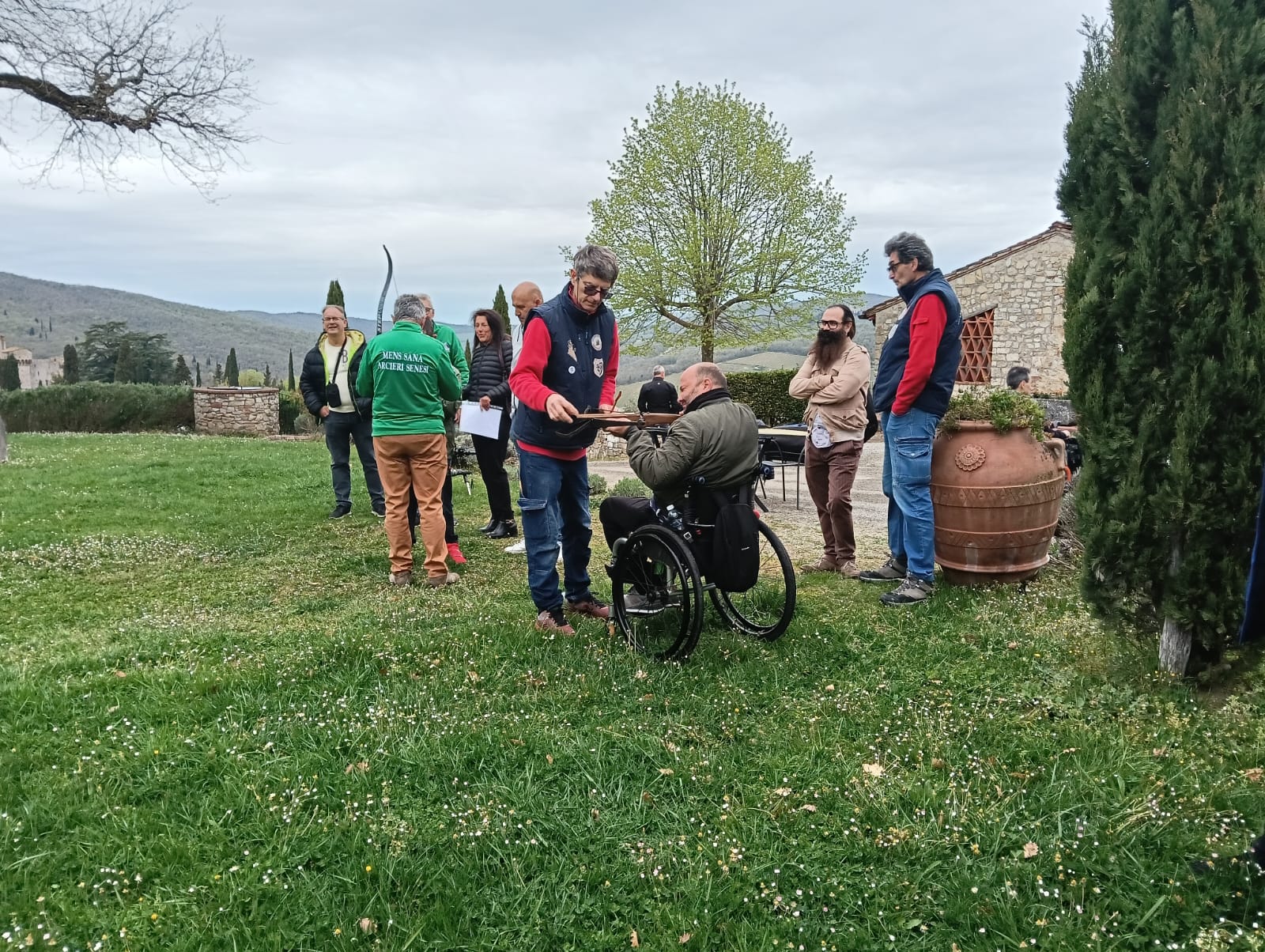 Il gruppo Balestrieri Monteaperti 1260 al Castello di Meleto, a Gaiole in Chianti, per l’evento dell’associazione Radici. Il team toscano conta sei atleti paralimpici
